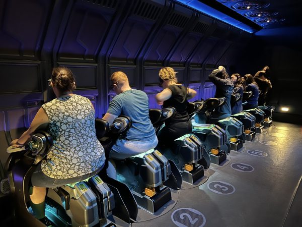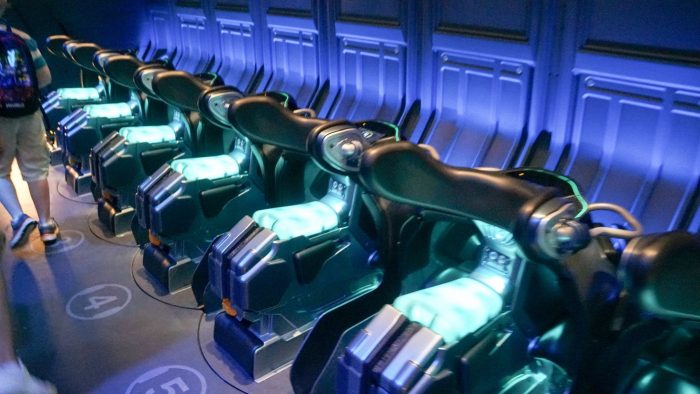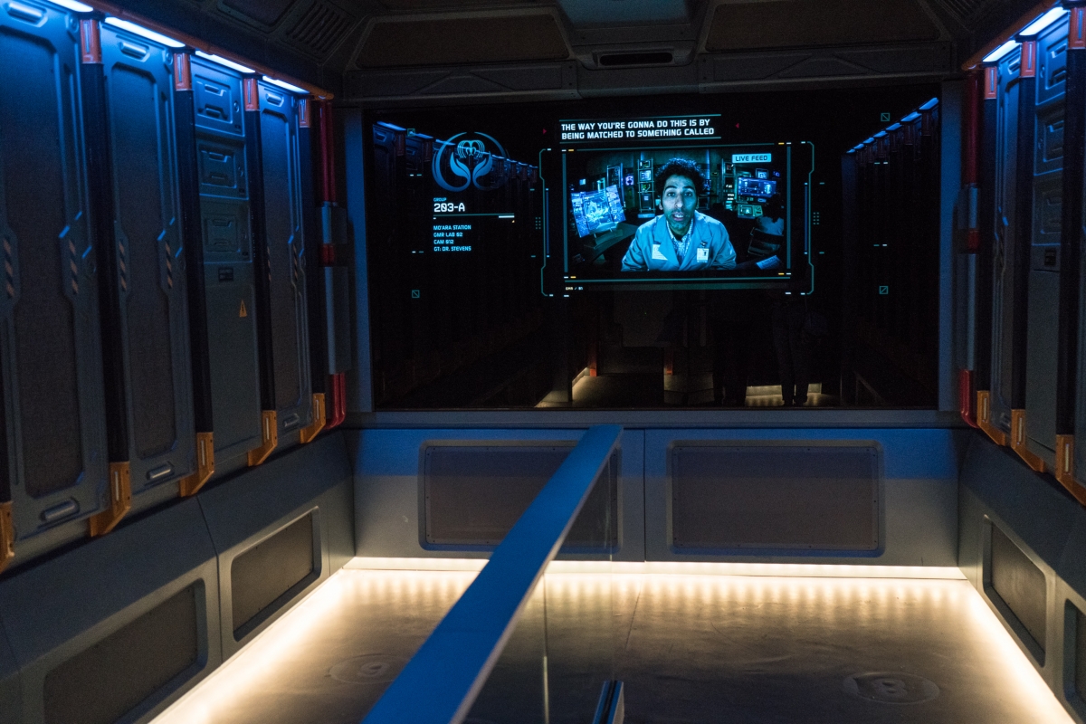 O prédio da Flight of Passage fica escondido atrás das montanhas flutuantes, e o percurso da fila é um espetáculo à parte, passando por cavernas, laboratórios com avatares em tanques de imersão e vistas deslumbrantes do Vale de Mo’ara.