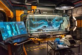 O prédio da Flight of Passage fica escondido atrás das montanhas flutuantes, e o percurso da fila é um espetáculo à parte, passando por cavernas, laboratórios com avatares em tanques de imersão e vistas deslumbrantes do Vale de Mo’ara.